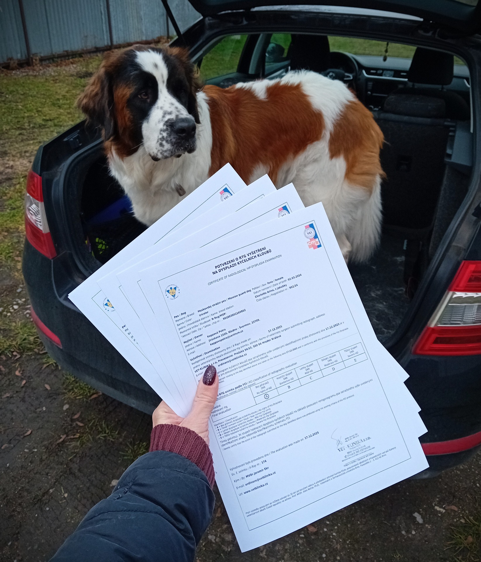 Charlotta Arina Z Jakubky ... RTG DKK A, RTG DLK 0/0, RTG vyšetření na OCD ramenních kloubů clear/clear, RTG vyšetření na přechodový lumbosakrální obratel LTV 0 - normální anatomický stav, RTG vyšetření na počet bederních obratlů - normální L7, RTG vyšetření na spondylózu 0 negativní.